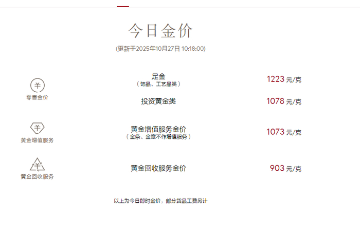 周大福足金饰品标价1223元/克,较10月25日1232元/克下跌9元/克。